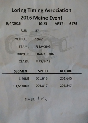 Also impressive was the 1/4 mile speed of 145.6 mph. This was the first attempt at the long course by Assault and Battery.Present were Adam Clark, Keith Howard, John Metric and Nathan Metric