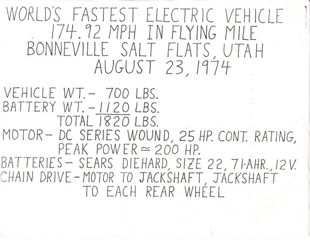 When Roger took his car to Bonneville in 1974 he established a new land speed record for electric cars of 175.061 MPH which held for over two decades until EV legends Lloyd Healy and Ed Rannberg came along. In the April 27th 1973 issue of National Dragster magazine with a photo of the car with the caption: